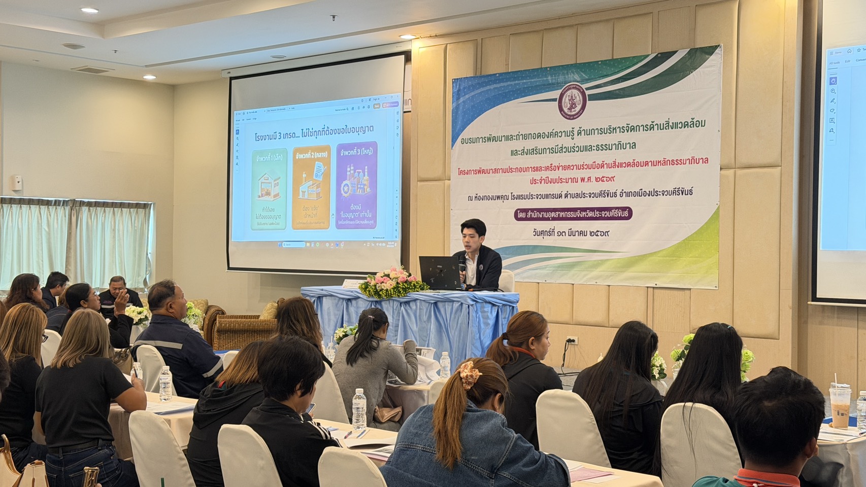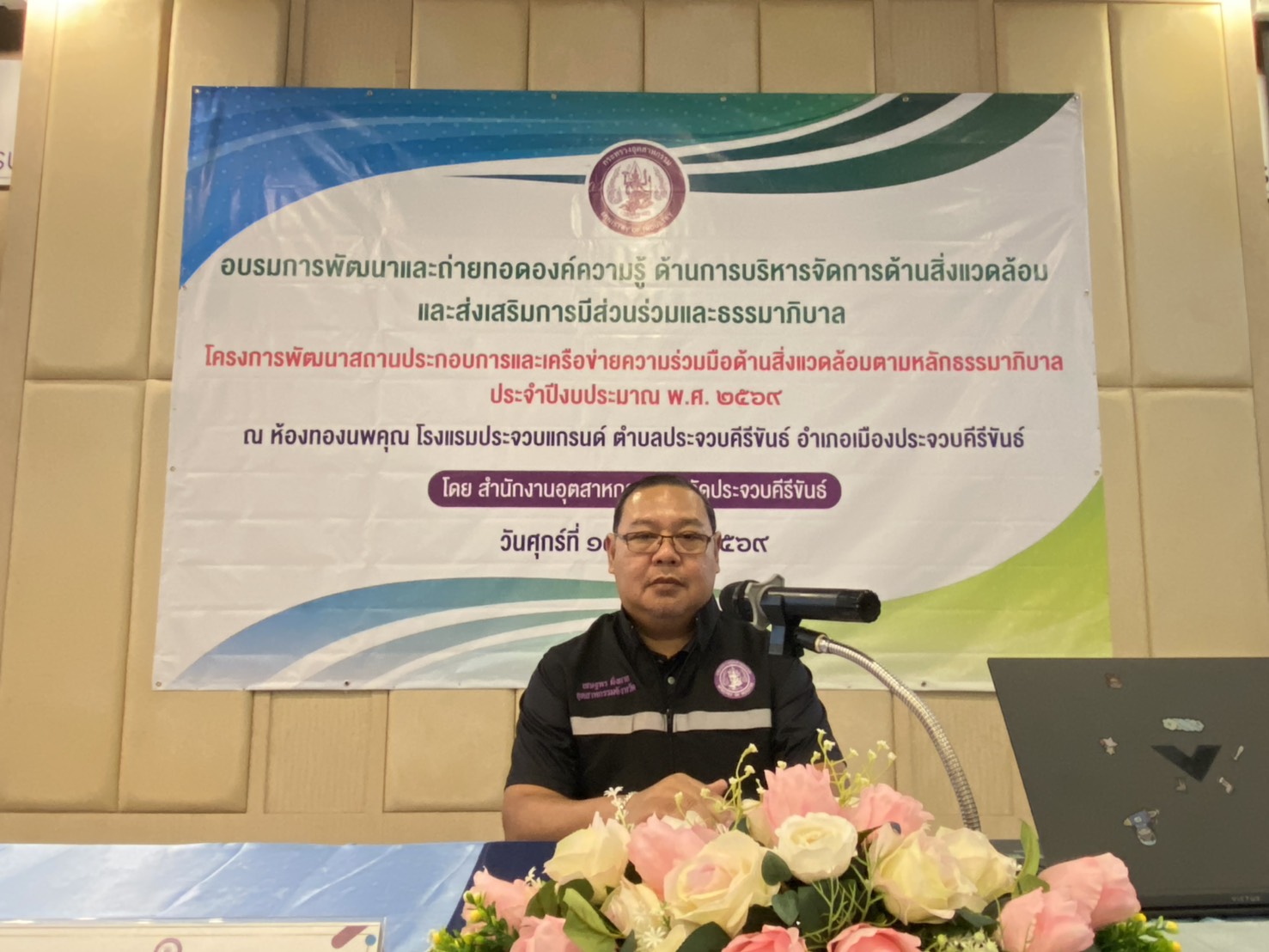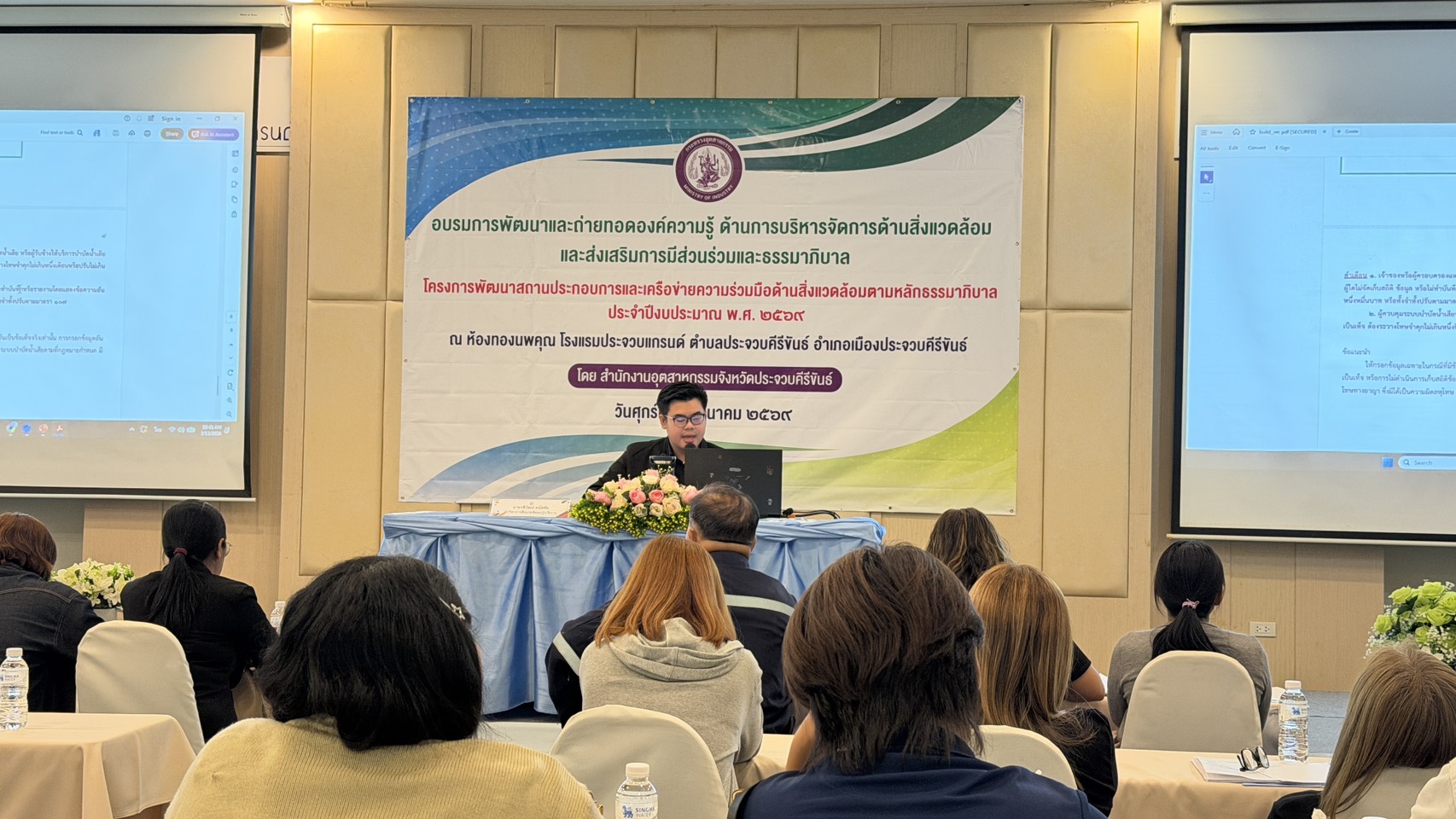 นายเชษฐพร ผึ่งผายอุตสาหกรรมจังหวัดประจวบคีรีขันธ์ เป็นประธานเปิดการอบรมการพัฒนาและถ่ายทอดองค์ความรู้ ด้านการบริหารจัดการด้านสิ่งแวดล้อมและส่งเสริมการมีส่วนร่วมและธรรมาภิบาล ภายใต้โครงการพัฒนาสถานประกอบการและเครือข่ายความร่วมมือด้านสิ่งแวดล้อมตามหลักธรรมาภิบาล ประจำปีงบประมาณ พ.ศ. 2569 ณ ห้องทองนพคุณ โรงแรมประจวบแกรนด์ ตำบลประจวบคีรีขันธ์ อำเภอเมือง จังหวัดประจวบคีรีขันธ์ ซึ่งมีผู้เข้าร่วมการอบรมฯ จำนวน 55 คน