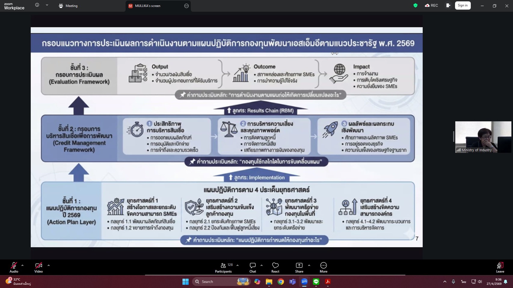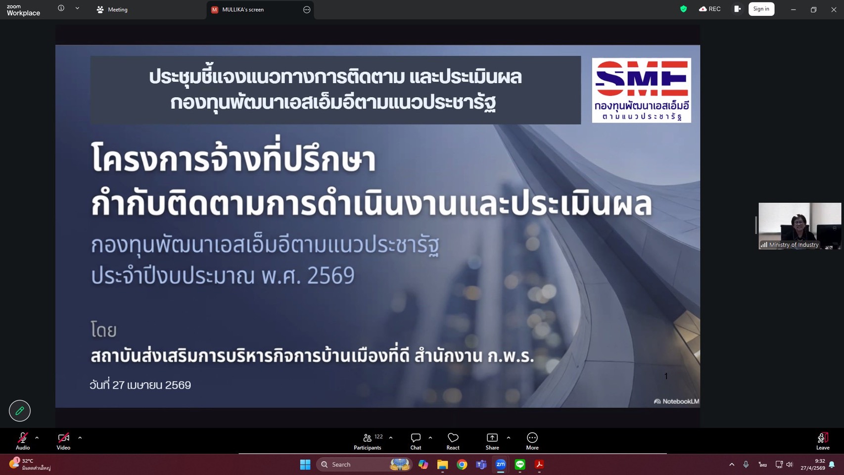 วันที่ 27 เมษายน 2569 เวลา 09.00 น. นายเชษฐพร ผึ่งผาย อุตสาหกรรมจังหวัดประจวบคีรีขันธ์ มอบหมายให้นางสาวอารีวรรณ จินตะสะวิน หัวหน้ากลุ่มส่งเสริมและพัฒนาอุตสาหกรรม พร้อมด้วยนางสาวพิลาวัลย์ ปี่แก้ว เจ้าหน้าที่บริหารงานทั่วไป เข้าร่วมประชุมชี้แจงแนวทางการติดตามและประเมินผล กองทุนพัฒนาเอสเอ็มอีตามแนวประชารัฐ ประจำปีงบประมาณ พ.ศ. 2569 เพื่อประเมินผลสัมฤทธิ์ และความคุ้มค่าจากการดำเนินโครงการสินเชื่อและโครงการส่งเสริมและพัฒนาเอสเอ็มอีภายใต้กองทุนพัฒนาเอสเอ็มอีตามแนวประชารัฐ ผ่านระบบออนไลน์ Zoom Meeting ณ สำนักงานอุตสาหกรรมจังหวัดประจวบคีรีขันธ์ โดยมี นางสาวณิรดา วิสุทธิชาติธาดา ผู้อำนวยการสำนักงานกองทุนพัฒนาเอสเอ็มอีตามแนวประชารัฐ เป็นประธานในการประชุมฯ